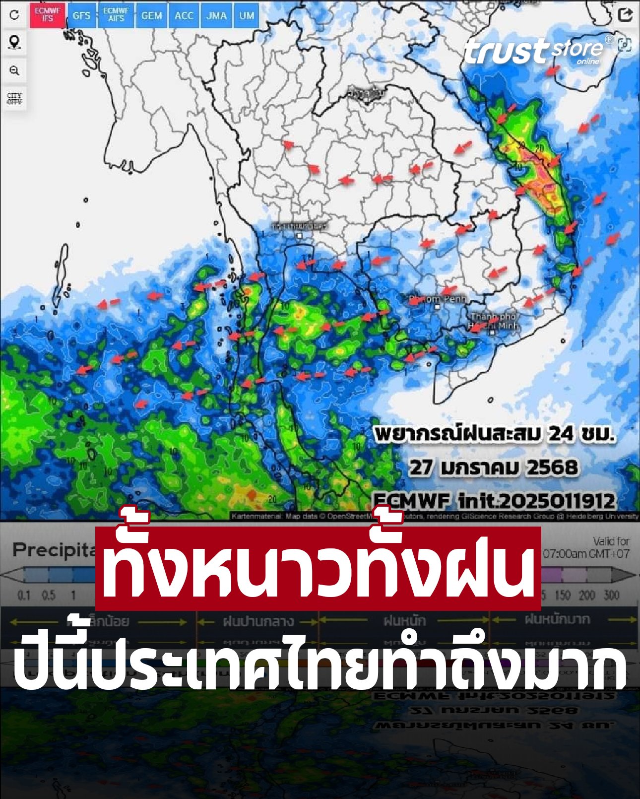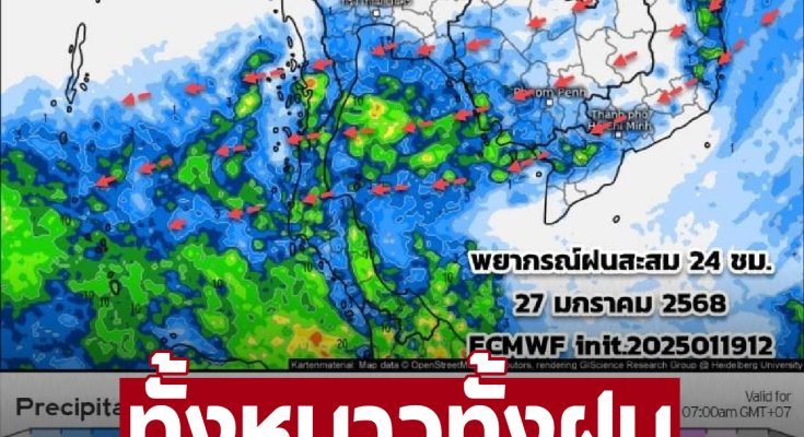 วันที่ 20 ม.ค.2568 กรมอุตุนิยมวิทยา อัพเดทผลการพยากรณ์ฝนสะสมรายวัน (ทุกๆ 24 ชม.:(นับตั้งแต่ 07.00น. ถึง 07.00น.วันรุ่งขึ้น) และลมที่ระดับ 925hPa (750 ม.)15 วันล่วงหน้า ระหว่าง 20 ม.ค. – 3 ก.พ.68 init. 2025011912 จากศูนย์พยากรณ์อากาศระยะกลางยุโรป (ECMWF) วิเคราะห์ตามผลจากแบบจำลองฯ เฉดสีแดงหมายถึงฝนหนัก สีเขียวหมายถึงฝนเล็กน้อย