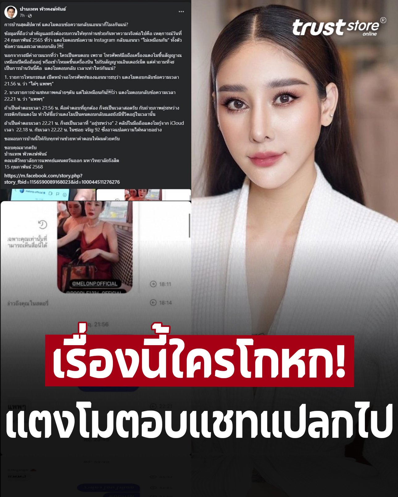 2. บางรายการนำแชทภาพคล้ายๆดัน แต่ไม่เหมือนกันว่า แตงโมตอบกลับข้อความเวลา 22.21 น. ว่า “แพพๆ”