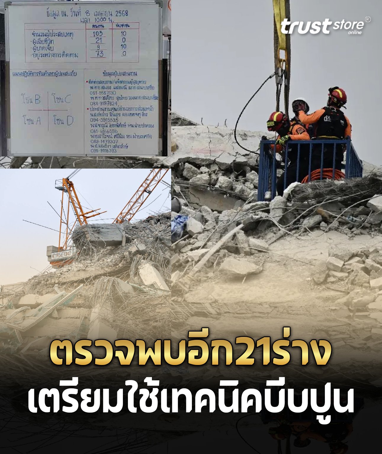 พบแล้ว 21 ราย ผู้เสียชีวิต ตึกสตง.ถล่ม จนท.เตรียมใช้เทคนิคตัดเหล็ก-บีบปูนเปิดโพรงเข้าถึงจุดวิกฤต ย้ำเจ้าหน้าที่ทุกฝ่ายยังคงระดมกำลังอย่างเต็มที่