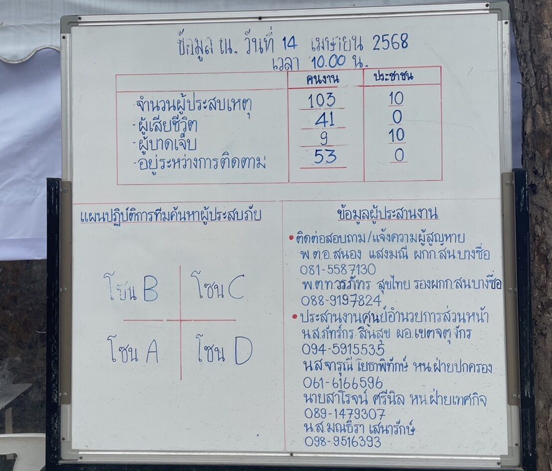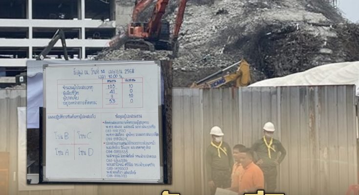 โดยขณะที่ข้อมูลจาก ศูนย์บัญชาการเหตุการณ์สำนักงานเขตจตุจักร สรุปยอดความคืบหน้าภารกิจกู้ภัยผู้สูญหายจากซากอาคารฯ ณ เวลา 10.00 น. ของวันที่ 14 เม.ย.68 จำนวนผู้ประสบเหตุ 103 ราย แยกเป็น ผู้เสียชีวิต 41 ราย ผู้บาดเจ็บ 9 ราย และยังมีผู้สูญหายอยู่ระหว่างค้นหา 53 ราย