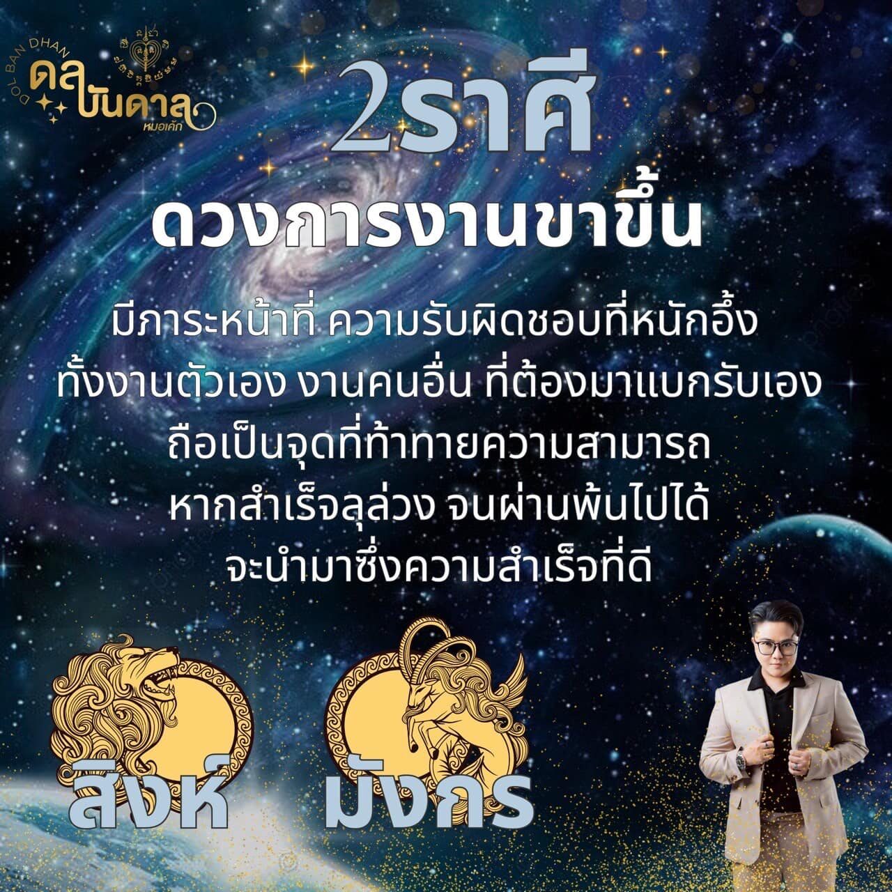หมอเค้ก Magic stone เปิดดวงชะตา 2 ราศี ดวงการงานขาขึ้น มีภาระหน้าที่ความรับผิดชอบที่หนักอึ้ง ทั้งงานตัวเอง งานคนอื่น ที่ต้องมาแบกรับเอง ถือเป็นจุดที่ท้าทายความสามารถ หากสำเร็จลุล่วง จนผ่านพ้นไปได้ จะนำมาซึ่งความสำเร็จที่ดี ประกอบด้วย ราศีสิงห์ และราศีมังกร
