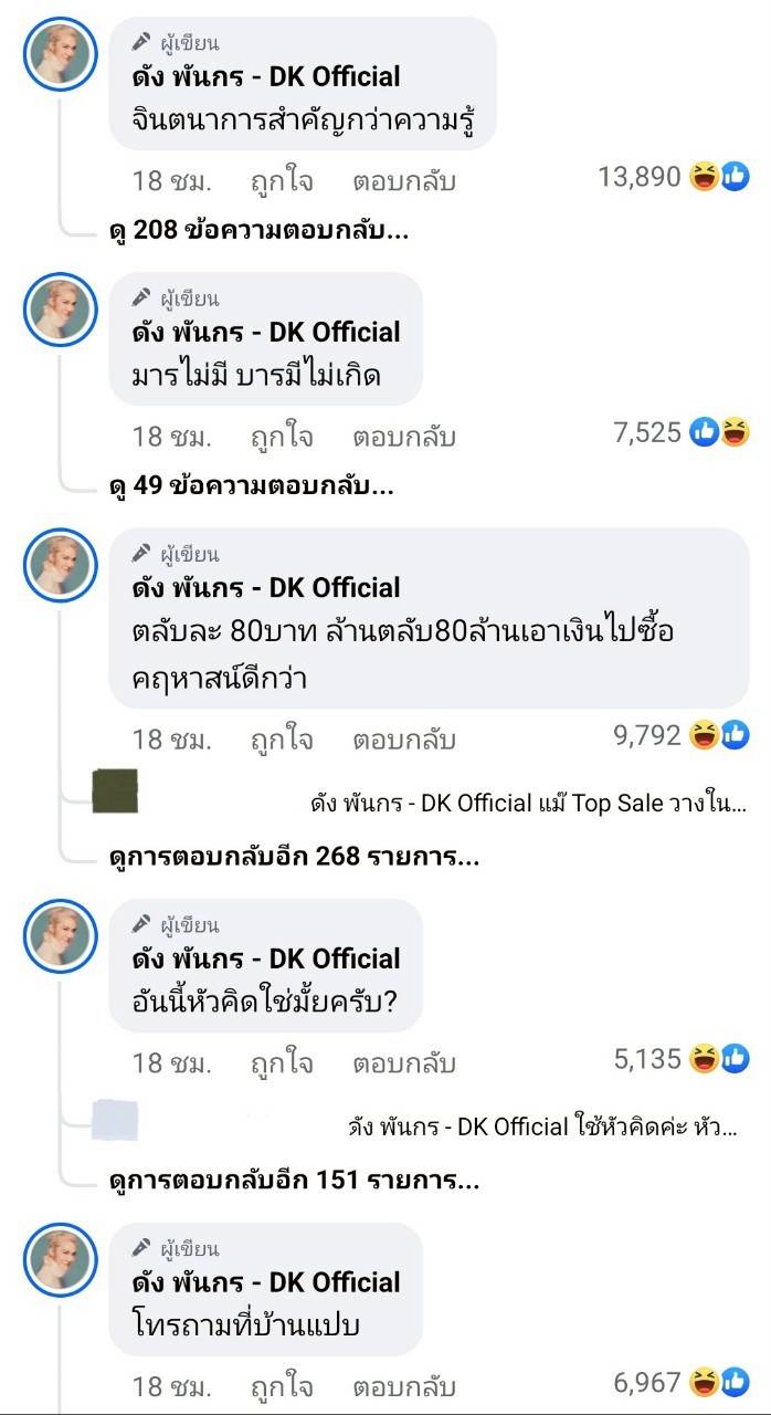 และคุณแม่ดังก็ยังได้พิมพ์ใต้คอมเมนต์ตัวเองอีกว่า“จินตนาการสำคัญกว่าความรู้”, “มารไม่มี บารมีไม่เกิด”, “ตลับละ 80 บาท ล้านตลับ 80 ล้านเอาเงินไปซื้ัอคฤหาสน์ดีกว่า”, “อันนี้หัวคิดใช่มั้ยครับ?”, “โทรถามที่บ้านแปป”