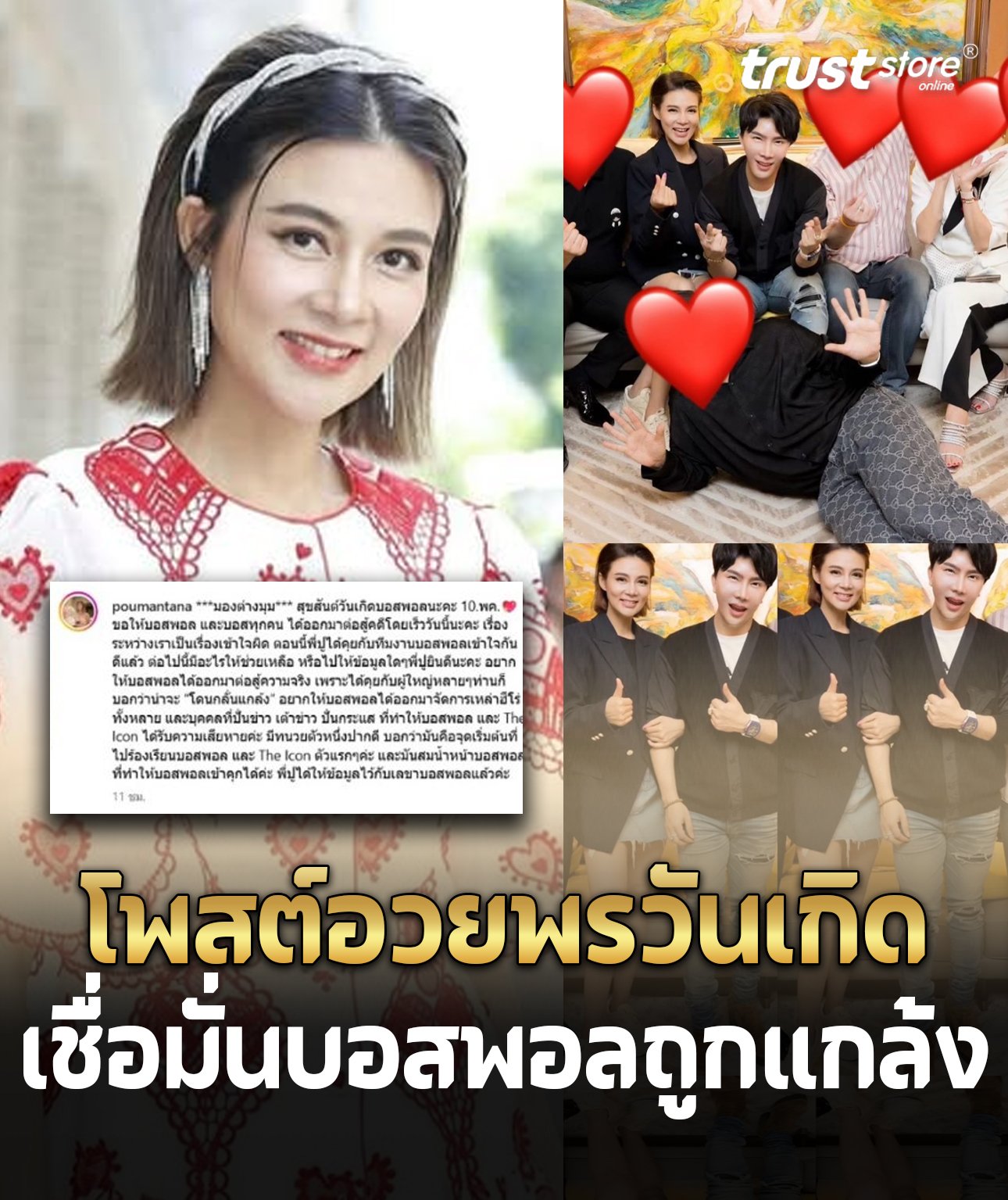 ในโพสต์ดังกล่าว ปู มัณฑนา ได้เขียนข้อความอวยพรเนื่องในวันคล้ายวันเกิดของบอสพอล (10 พฤษภาคม) และแสดงความเชื่อมั่นว่าบอสพอลและผู้บริหารคนอื่นๆ กำลังถูก “กลั่นแกล้ง” พร้อมทั้งให้กำลังใจให้ทุกคนออกมาต่อสู้คดีโดยเร็ว
