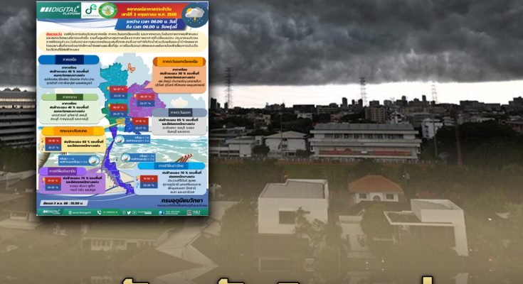 กรมอุตุนิยมวิทยา พยากรณ์ สภาพอากาศวันนี้ ฝนหนัก 43 จังหวัดโดนถล่ม ใต้อ่วม กทม.60% ของพื้นที่ แนะระวังน้ำท่วมฉับพลัน น้ำป่าหลาก