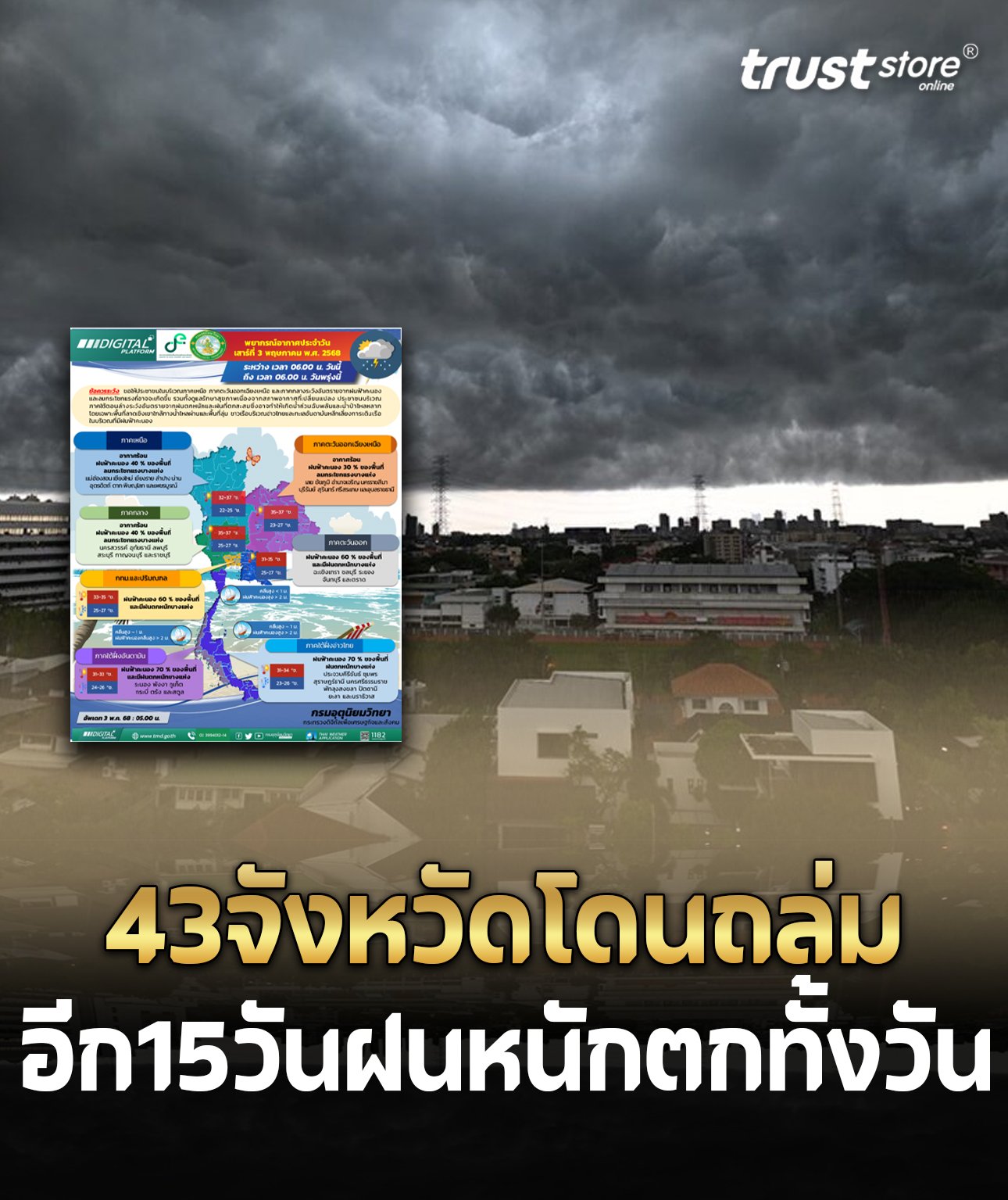 กรมอุตุนิยมวิทยา พยากรณ์ สภาพอากาศวันนี้ ฝนหนัก 43 จังหวัดโดนถล่ม ใต้อ่วม กทม.60% ของพื้นที่ แนะระวังน้ำท่วมฉับพลัน น้ำป่าหลาก