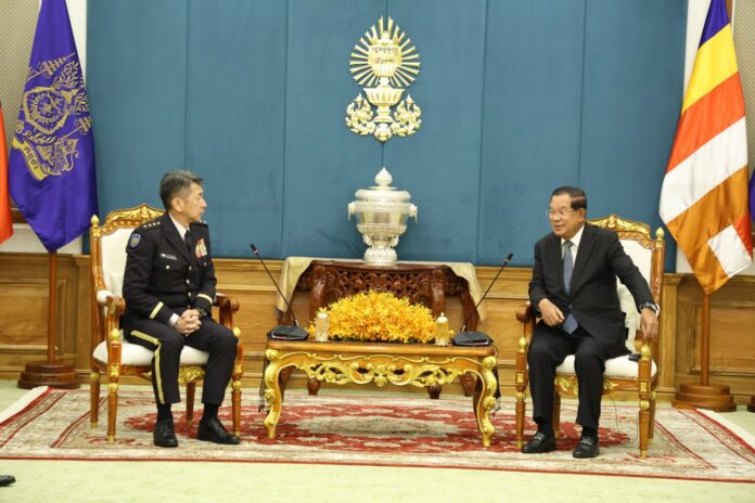 สำนักข่าวต่างประเทศ รายงานว่า เมื่อวันที่ 24 มิ.ย. พลเอกโมริชิตะ ยาสุโนริ หัวหน้าเสนาธิการกองกำลังภาคพื้นดิน ของกองกำลังป้องกันตนเองญี่ปุ่น เข้าพบ ฮุนมาเนต นายกรัฐมนตรีกัมพูชา ระหว่างการเยือนกัมพูชาอย่างเป็นทางการ