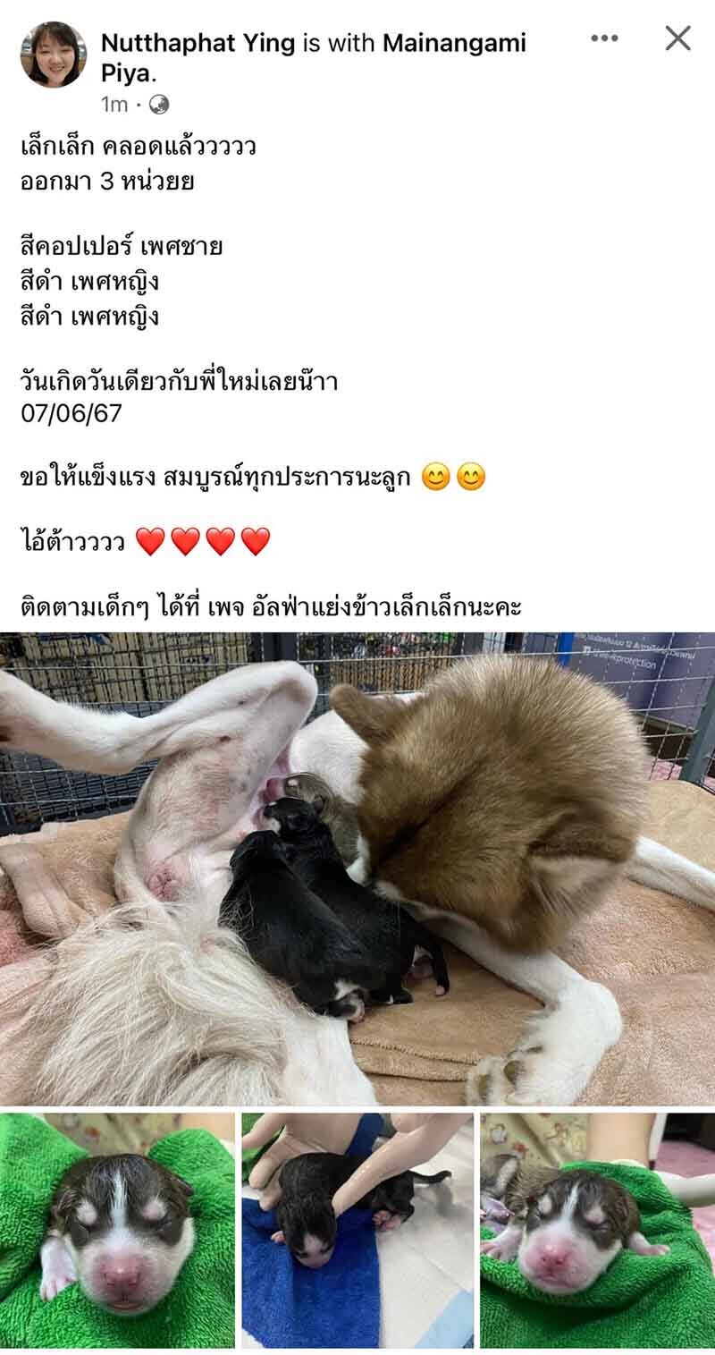 วันที่ 7 มิ.ย. 2567 ผู้สื่อข่าวรายงานว่า เมื่อเวลา 21.01 น. ผู้ใช้เฟซบุ๊กชื่อ Nutthaphat Ying หรือคุณหญิง ที่เป็นคนช่วยประสานงานเรื่อง “หมวยเล็ก” หรือ “เล็ก” สุนัขไซบีเรียน เพศเมีย ที่ตั้งท้อง และถูกเจ้าของเก่าราดน้ำร้อนใส่ จนได้รับการย้ายบ้านไปอยู่ในความดูแลของคุณใหม่ เจ้าของร้านไก่ทอดเกาหลี ได้โพสต์แจ้งข่าวดีให้ผู้ติดตามได้ทราบ