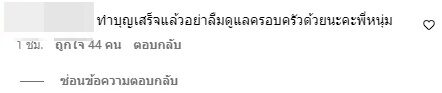 แต่ก็ยังไม่วายโดนชาวเน็ต เข้ามาแซะผ่านโพสต์ดังกล่าวว่า “ทำบุญเสร็จแล้วอย่าลืมดูแลครอบครัวด้วยนะคะพี่หนุ่ม”