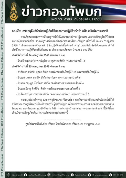 ‘กองทัพบก’ ขอสดุดีแด่กำลังพลผู้เสียชีวิต 6 นาย กล้าหาญ เสียสละจากการปฏิบัติหน้าที่ปกป้ออธิปไตยของชาติ จากเหตุการณ์ปะทะชายแดนไทย–กัมพูชา