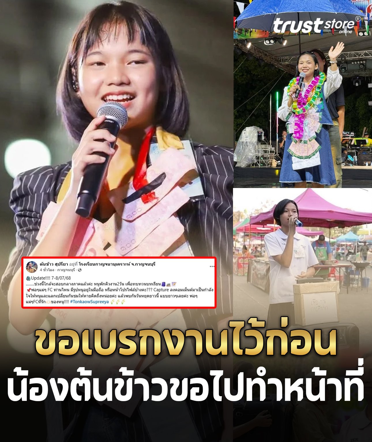 โดย ต้นข้าว ได้ออกมาโพสต์ข้อความและภาพชู 2 นิ้ว ผ่านเพจเฟซบุ๊ก พร้อมขอกำลังใจจากแฟนคลับว่า “Update!!!! 7-8/07/68 ช่วงนี้ใกล้จะสอบกลางภาคแล้วค่ะ หนูพักคิวงาน 2 วัน เพื่อทบทวนบทเรียน พ่อๆ แม่ๆ FC ท่านไหน มีรูปหนูอยู่ในมือถือ หรือหน้าโปรไฟล์บ้างคะ Capture ลงคอมเมนต์มาเป็นกำลังใจให้หนูและแลกเปลี่ยนกันชมให้หายคิดถึงหน่อยค่ะ แล้วพบกันวันหยุดยาวนี้ แบบยาวๆ เลยค่ะ พ่อๆ แม่ๆ FCที่รักของหนู!!!! #TonkaowSupreeya”