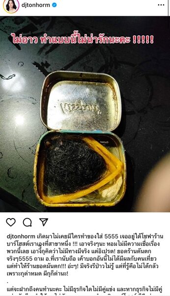 แต่ทว่าล่าสุดทำเอาอึ้งไปตาม ๆ เมื่อ “ต้นหอม” ออกมาเปิดภาพ เจอเส้นผมและสิ่งของที่คล้ายการทำของใส่ ถูกวางอยู่ใต้โซฟาที่ร้านธุรกิจบาร์โฮสต์ของเธอในสาขาหนึ่ง