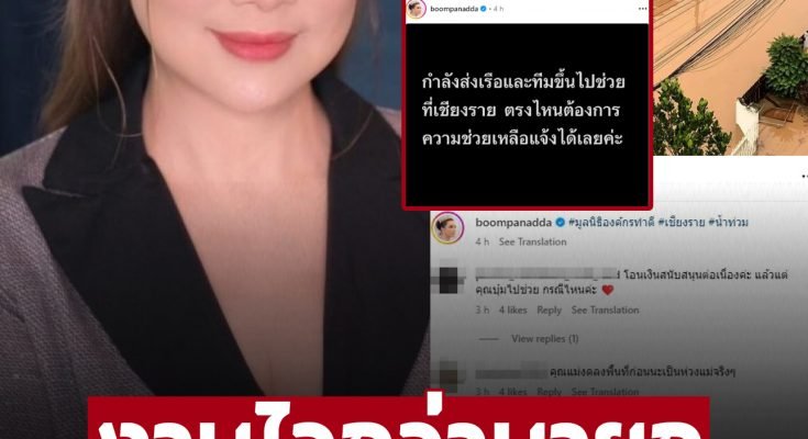 ล่าสุด บุ๋ม ปนัดดา ในฐานะประธานมูลนิธิองค์กรทำดี ได้เคลื่อนไหวเรื่องการช่วยเหลือประชาชน โดยโพสต์อินสตราแกรม @boompanadda บอกว่า “กำลังส่งเรือและทีมขึ้นไปช่วยเหลือที่เชียงราย ตรงไหนต้องการความช่วยเหลือ แจ้งได้เลยค่ะ” และระบุแคปชั่นเพิ่มเติมบอกว่า “#มูลนิธิองค์กรทำดี #เชียงราย #น้ำท่วม”ท่ามกลางชาวเน็ตแห่ชื่นชม อาทิ ‘โอนเงินสนับสนุนต่อเนื่องค่ะ แล้วแต่คุณบุ๋มไปช่วย กรณีไหนค่ะ , คุณแม่งดลงพื้นที่ก่อนนะเป็นห่วงแม่จริงๆ , เปิดรับบริจาคบอกด้วยนะคะพี่ คนละนิดคนละหน่อยอยากช่วยค่ะ , ทำงานไวและเก่งมากค่ะ เร็วกว่าหน่วยงานราชการอีกค่ะ , แม่บุ๋มไม่เคยพลาดเรื่องช่วยเหลือชาวบ้าน เป็นต้น’