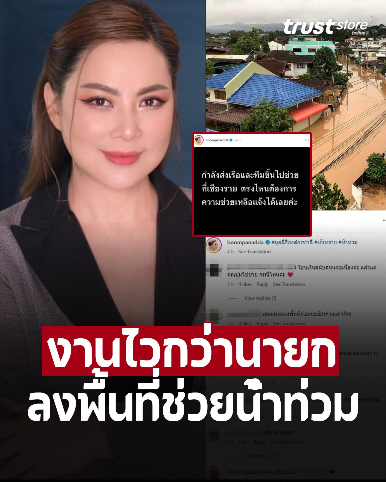 ล่าสุด บุ๋ม ปนัดดา ในฐานะประธานมูลนิธิองค์กรทำดี ได้เคลื่อนไหวเรื่องการช่วยเหลือประชาชน โดยโพสต์อินสตราแกรม @boompanadda บอกว่า “กำลังส่งเรือและทีมขึ้นไปช่วยเหลือที่เชียงราย ตรงไหนต้องการความช่วยเหลือ แจ้งได้เลยค่ะ” และระบุแคปชั่นเพิ่มเติมบอกว่า “#มูลนิธิองค์กรทำดี #เชียงราย #น้ำท่วม”ท่ามกลางชาวเน็ตแห่ชื่นชม อาทิ ‘โอนเงินสนับสนุนต่อเนื่องค่ะ แล้วแต่คุณบุ๋มไปช่วย กรณีไหนค่ะ , คุณแม่งดลงพื้นที่ก่อนนะเป็นห่วงแม่จริงๆ , เปิดรับบริจาคบอกด้วยนะคะพี่ คนละนิดคนละหน่อยอยากช่วยค่ะ , ทำงานไวและเก่งมากค่ะ เร็วกว่าหน่วยงานราชการอีกค่ะ , แม่บุ๋มไม่เคยพลาดเรื่องช่วยเหลือชาวบ้าน เป็นต้น’