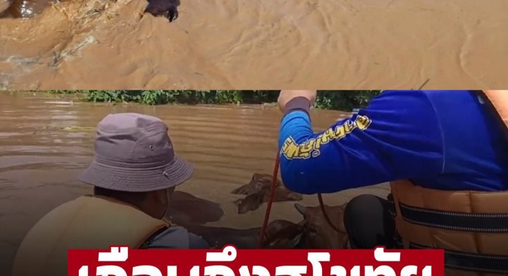 หวั่นลอยไกลจากแพร่ถึงสุโขทัย ล่าสุดกู้ภัยช่วยเหลือแล้ว ฝูงวัวถูกน้ำซัดลอยคอตามกระแสน้ำ