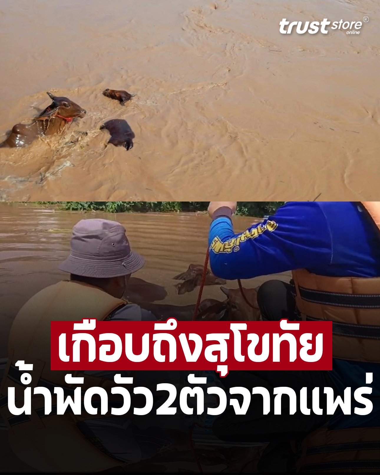 หวั่นลอยไกลจากแพร่ถึงสุโขทัย ล่าสุดกู้ภัยช่วยเหลือแล้ว ฝูงวัวถูกน้ำซัดลอยคอตามกระแสน้ำ
