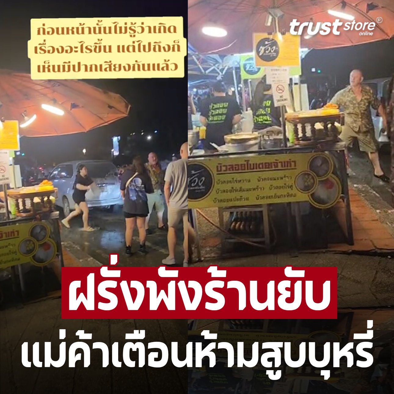 ดุเดือดกลางตลาดช้างเผือก ร้านบัวลอยเตือนดีๆ ห้ามสูบบุหรี่ ฝรั่งโมโห พังร้าน โยนบุหรี่ใส่ ก่อนถูกสาดน้ำ ร้านแจงไม่ได้ตั้งใจขว้างถัง แค่จะสาดน้ำดับบุหรี่ที่ติดไฟ