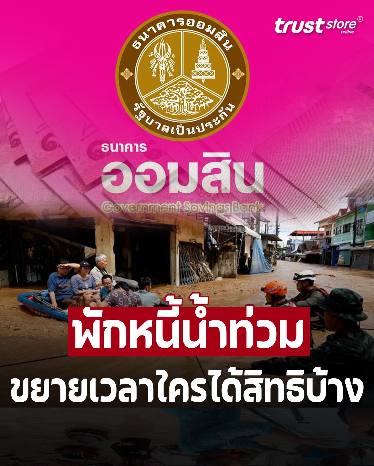 ธนาคารออมสินรับมอบนโยบายจากรัฐบาลโดย น.ส.แพทองธาร ชินวัตร นายกรัฐมนตรี และนายพิชัย ชุณหวชิร รองนายกรัฐมนตรีและรัฐมนตรีว่าการกระทรวงการคลัง ให้ขยายระยะเวลามาตรการพักหนี้อัตโนมัติ จาก 3 เดือน เป็น 6 เดือน เพื่อกระจายความช่วยเหลือให้ทั่วถึงลูกหนี้ที่ประสบอุทกภัยตามประกาศของกรมป้องกันและบรรเทาสาธารณภัยในปัจจุบัน ที่ล่าสุดได้เพิ่มรายชื่อจังหวัดและพื้นที่ได้รับผลกระทบกินบริเวณกว้างมากขึ้นเป็น 43 จังหวัด 5,515 หมู่บ้าน (จากเดิม 41 จังหวัด 4,000 หมู่บ้าน) และมีจุดที่ต้องประสบภัยน้ำท่วมซ้ำเติมอีกระลอก จนทำให้ผู้ได้รับผลกระทบมีจำนวนเพิ่มขึ้นมาก ธนาคารจึงดำเนินการตามนโยบายให้ขยายระยะเวลาพักหนี้อัตโนมัติ จาก 3 เดือน เป็น 6 เดือน และเพิ่มจำนวนผู้ได้รับสิทธิพักหนี้ตามมาตรการนี้ จากเดิม 110,000 บัญชี เป็น 140,000 บัญชี คิดเป็นเม็ดเงินที่ธนาคารลดดอกเบี้ยช่วยบรรเทาความเดือดร้อนของผู้ได้รับผลกระทบเป็นจำนวนเงินกว่า 2,000 ล้านบาท