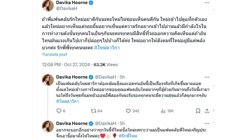 ล่าสุด เรื่องนี้ก็ไปถึงหูสาวใหม่แล้ว เจ้าตัวไม่ปล่อยให้เกิดดราม่านาน รีบออกมาชี้โดยด่วน ผ่านทางแพลตฟอร์มเอ็กซ์ส่วนตัว @DavikaH ระบุว่า