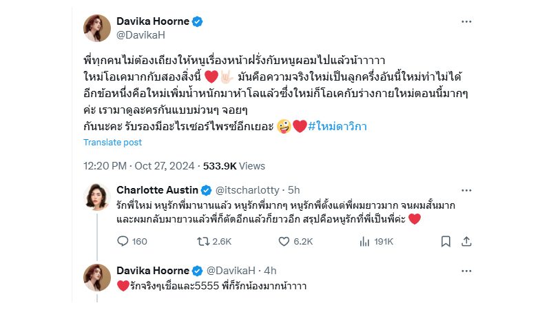 แถม ชาล็อต ออสติน นักแสดง-นางงาม ก็เข้ามาคอมเมนต์ให้กำลังใจสาวใหม่เรียกรอยยิ้มด้วยว่า “รักพี่ใหม่ หนูรักพี่มานานแล้ว หนูรักพี่มาก ๆ หนูรักพี่ตั้งแต่พี่ผมยาวมาก จนผมสั้นมาก และผมกลับมายาวแล้วพี่ก็ตัดอีก แล้วก็ยาวอีก สรุป คือ หนูรักที่พี่เป็นพี่ค่ะ”