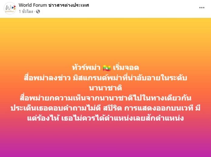 เพจดังแฉ ทัวร์พม่าเริ่มจอด สื่อพม่าลงข่าว มิสแกรนด์พม่าที่น่าอับอายในระดับนานาชาติ ยกความเห็นจากนานาชาติไปในทางเดียวกัน เธอไม่ควรได้ตำแหน่งเลยสักตำแหน่ง
