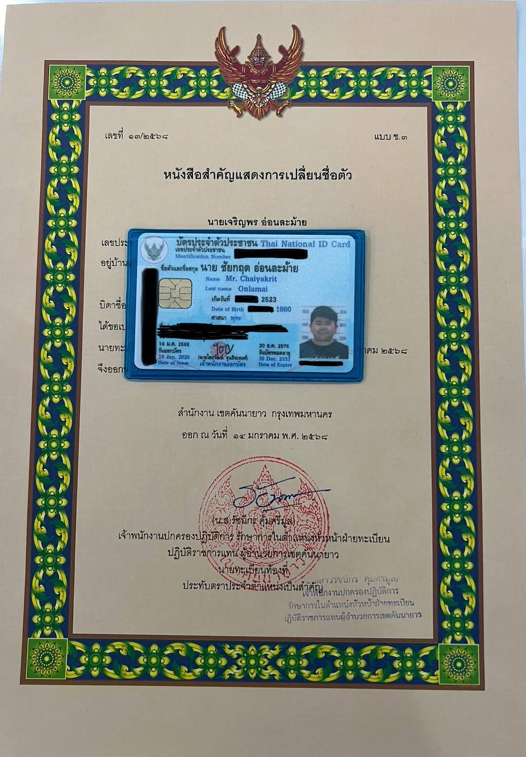 ล่าสุดด้าน โก๊ะตี๋ ได้ออกมาโพสต์ภาพผ่านอินสตาแกรมส่วนตัว ด้วยการแนบใบเปลี่ยนชื่อและบัตรประชาชนใบใหม่ พร้อมโชว์ชื่อใหม่ โดยระบุแคปชั่นว่า เรียกข้าพเจ้าว่า “ชัยกฤต” ซึ่งด้านโก๊ะตี๋ได้เปลี่ยนชื่อจาก “เจริญพร อ่อนละม้าย” เป็นชื่อใหม่ไฉไลกว่าเดิมคือ “ชัยกฤต อ่อนละม้าย”