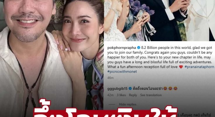 (“มีคนถึง 8.2 พันล้านคนในโลกนี้ และเราดีใจมากที่ได้คุณมาเป็นส่วนหนึ่งของครอบครัวเรา ขอแสดงความยินดีอีกครั้งนะ พวกเรามีความสุขมาก ๆ ที่ได้เห็นความรักของคุณทั้งคู่ นี่คือจุดเริ่มต้นของบทใหม่ในชีวิต ขอให้คุณทั้งสองมีชีวิตคู่ที่ยาวนานและเปี่ยมไปด้วยความสุข พร้อมการผจญภัยที่น่าตื่นเต้นมากมาย งานเลี้ยงต้อนรับช่วงบ่ายวันนี้เต็มไปด้วยความรักและสนุกสนานจริง ๆ”) พร้อมติดแฮชแท็ก #pranainataphorn #picnicwithmonet