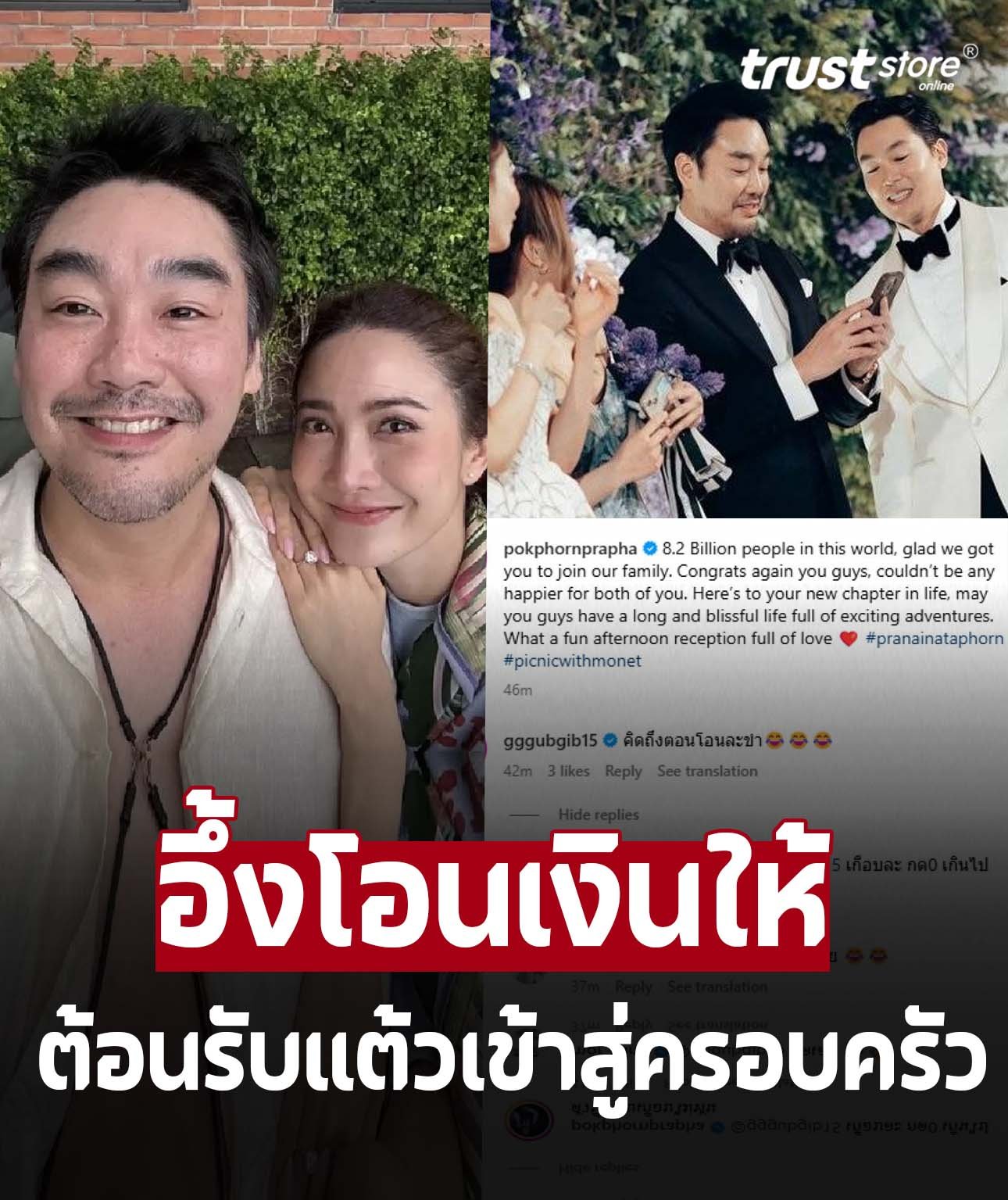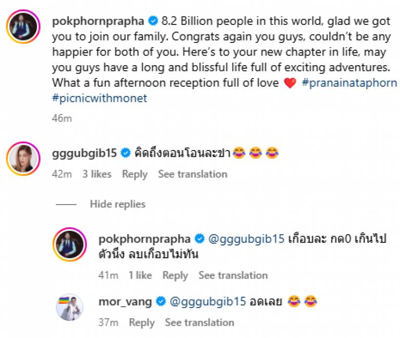 (“มีคนถึง 8.2 พันล้านคนในโลกนี้ และเราดีใจมากที่ได้คุณมาเป็นส่วนหนึ่งของครอบครัวเรา ขอแสดงความยินดีอีกครั้งนะ พวกเรามีความสุขมาก ๆ ที่ได้เห็นความรักของคุณทั้งคู่ นี่คือจุดเริ่มต้นของบทใหม่ในชีวิต ขอให้คุณทั้งสองมีชีวิตคู่ที่ยาวนานและเปี่ยมไปด้วยความสุข พร้อมการผจญภัยที่น่าตื่นเต้นมากมาย งานเลี้ยงต้อนรับช่วงบ่ายวันนี้เต็มไปด้วยความรักและสนุกสนานจริง ๆ”) พร้อมติดแฮชแท็ก #pranainataphorn #picnicwithmonet