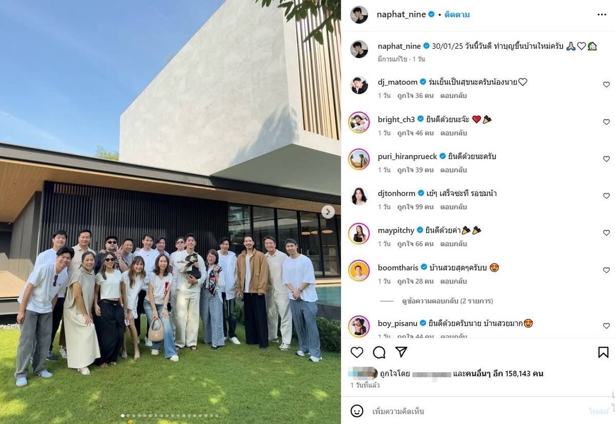 เรียกได้ว่าเป็นเรื่องราวดีๆ ของพระเอกหนุ่ม “นาย ณภัทร” ที่ได้ถือฤกษ์งามยามดีนิมนต์พระทำบุญเป็นสิริมงคลขึ้นบ้านใหม่เมื่อวันที่ 30 ม.ค. 68 ที่ผ่านมา โดยพระเอกหนุ่มโพสต์ภาพและคลิปบรรยากาศที่บ้านหลังงาม พร้อมแคปชั่นว่า “30/01/25 วันนี้วันดี ทำบุญขึ้นบ้านใหม่ครับ” ท่ามกลางบรรยากาศสุดอบอุ่นที่มีเพื่อนๆ ในวงการบันเทิงจำนวนมากเดินทางมาร่วมยินดีกันอย่างมากมาย