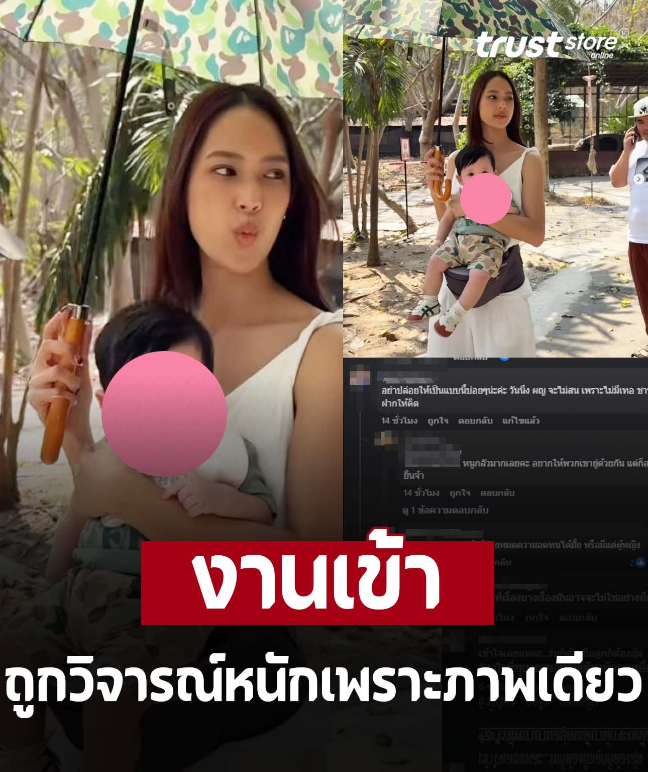 ทั้งนี้ มีภาพที่สาวใบหม่อนทั้งอุ้มลูก ถือร่ม เดินลำพัง ด้านหลังมีหนุ่มแจ็คเดินตาม คุยโทรศัพท์อยู่ ภาพนี้ภาพเดียวถูกแชร์ว่อนโซเชียล จนเกิดดราม่าเบาๆลงที่หนุ่มแจ็ค เช่น ‘แจ็คเดินตัวปลิวเลยนะ ฉันในฐานะแม่ ถ้าไปห้างหรือตลาด จอดรถปุ้บพ่อจะเข้ามาอุ้มลูกทันทีโดยไม่ต้องบอก, มือซ้ายประคองลูก มือขวาถือร่ม เก่งมากครับ , จริงสุด มือพ่อเอาไว้ทำอะไร อย่างน้อยถือร่มไหม , อย่าปล่อยให้เป็นแบบนี้บ่อยๆน่ะค่ะ วันนึง ผญ จะไม่สน เพราะไม่มีเทอ ชานกับลูกก้ออยู่ได้ ฝากให้คิด เป็นต้น’ซึ่งจริงๆแล้ว ไม่ได้มีแค่ภาพนี้ภาพเดียว บรรยากาศในวันนั้น ภาพที่สาวใบหม่อนโพสต์ลงก็มีมุมที่หนุ่มแจ็คถือร่มให้ คอยดูแลอยู่ตลอด
