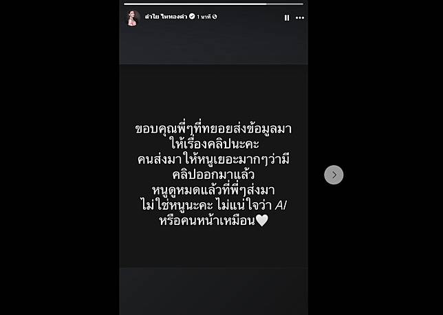 โดยเมื่อวันที่ 7 มี.ค.ที่ผ่านมา ลำไย ไหทองคำ โพสต์ข้อความระบุว่า “ขอบคุณพี่ๆที่ทยอยส่งข้อมูลมาให้เรื่องคลิปนะคะ คนส่งมาให้หนูเยอะมากๆว่ามีคลิปออกมาแล้ว หนูดูหมดแล้วที่พี่ๆส่งมา ไม่ใช่หนูนะคะ ไม่แน่ใจว่า AI หรือคนหน้าเหมือน”