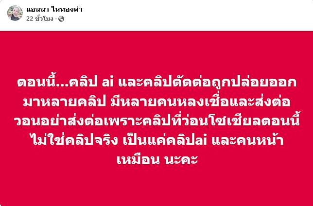 นอกจากนี้ แอนนา ไหทองคำ ภรรยาของ ประจักษ์ชัย ไหทองคำ โพสต์ประเด็นนี้ด้วยว่า “ตอนนี้…คลิป AI และคลิปตัดต่อถูกปล่อยออกมาหลายคลิป มีหลายคนหลงเชื่อและส่งต่อ วอนอย่าส่งต่อ เพราะคลิปที่ว่อนโซเชียลตอนนี้ไม่ใช่คลิปจริง เป็นแค่คลิป AI และคนหน้าเหมือน นะคะ”