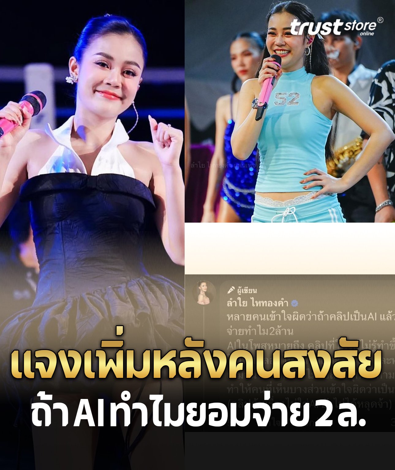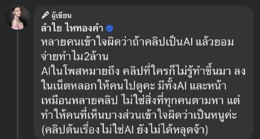 ลำไย ไหทองคำ แจงเพิ่มปมคลิป หลังคนสงสัย ถ้าเป็น AI ทำไมยอมจ่าย 2 ล้าน หมายถึงคลิปที่ใครก็ไม่รู้ทำขึ้นมา มีทั้ง AI และหน้าเหมือน ไม่ใช่สิ่งที่ทุกคนตามหา