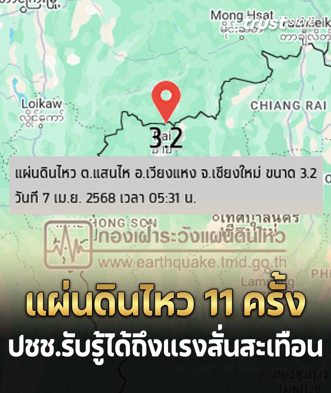 ครั้งที่ 11 เวลา 12.16 น. เกิดแผ่นดินไหวในพื้นที่ต.แสนไห อ.เวียงแหง จ.เชียงใหม่ ตรวจสอบพบมีขนาด 3.3 แมกนิจูด และมีความลึก 1 กม.