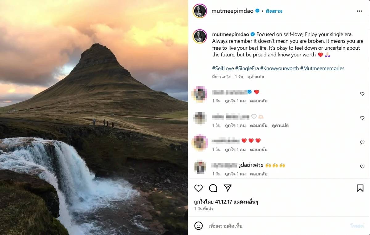 โดยสาวมัดหมี่ พิมดาว ได้โพสต์ข้อความระบุว่า “Focused on self-love, Enjoy your single era. Always remember it doesn’t mean you are broken, it means you are free to live your best life. It’s okay to feel down or uncertain about the future, but be proud and know your worth ❤️🙏🏻”ซึ่งมีใจความว่า “โฟกัสที่การรักตัวเอง สนุกกับช่วงเวลาที่โสด จำไว้ว่าการเป็นโสดไม่ได้หมายความว่าคุณมีข้อบกพร่อง แต่มันคือการที่คุณมีอิสระในการใช้ชีวิตอย่างดีที่สุด ถึงจะมีบางวันที่รู้สึกเศร้าหรือไม่แน่ใจกับอนาคต แต่จงภูมิใจและรู้คุณค่าของตัวเองเสมอ”งานนี้ไม่ต้องเสียใจ เพราะสาวมัดหมี่กำลังใช้ชีวิตในแบบที่มีความสุขในแบบตัวเอง เตรียมพร้อมสำหรับทุกโอกาสดี ๆ ที่กำลังรออยู่ข้างหน้า แฟน ๆ ต่างก็ส่งกำลังใจให้รัว ๆ