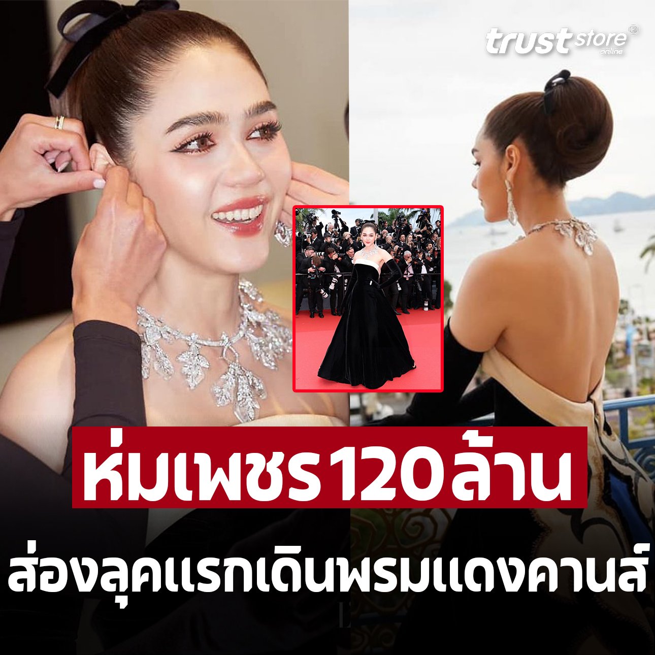 พร้อมเครื่องประดับเพชรสัญชาติฝรั่งเศส ที่มีทั้งสร้อยคอ เเหวน เเละ ตุ้มหู จากคอลเลกชั่นไฮจิวเวลรี่ Hiver Impérial จาก Boucheron ราคารวมเเล้วกว่า 120 ล้านบาท