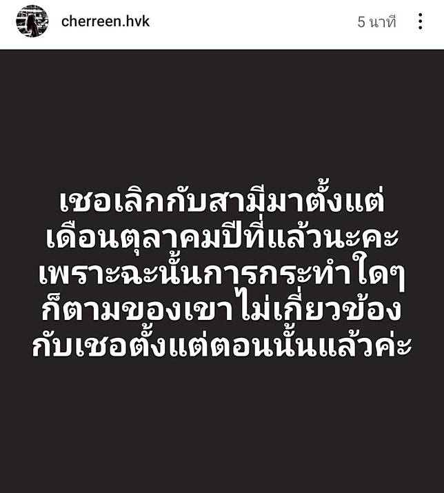 โดย เชอรีน ได้เผยว่า “เชอเลิกกับสามีมาตั้งแต่เดือนตุลาคมปีที่แล้วนะคะ เพราะฉะนั้นการกระทำใดๆ ก็ตามของเขา ไม่เกี่ยวข้องกับเชอตั้งแต่ตอนนั้นแล้วค่ะ”