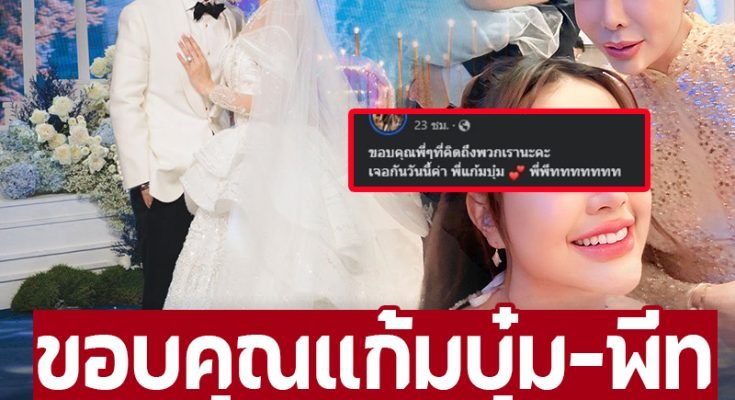 เจอกันวันนี้ค่า พี่แก้มบุ๋ม พี่พีททททททท” และบอกว่า “ยินดีกับพี่แก้มบุ๋มของพี่พีทททททททด้วยนะคะ”ต่อมา เผยบรรยากาศงานฉลองมงคลสมรสสุดอลังการ พร้อมหน้าดารารุ่นพี่หลายคนที่เป็นกันเองมากๆ