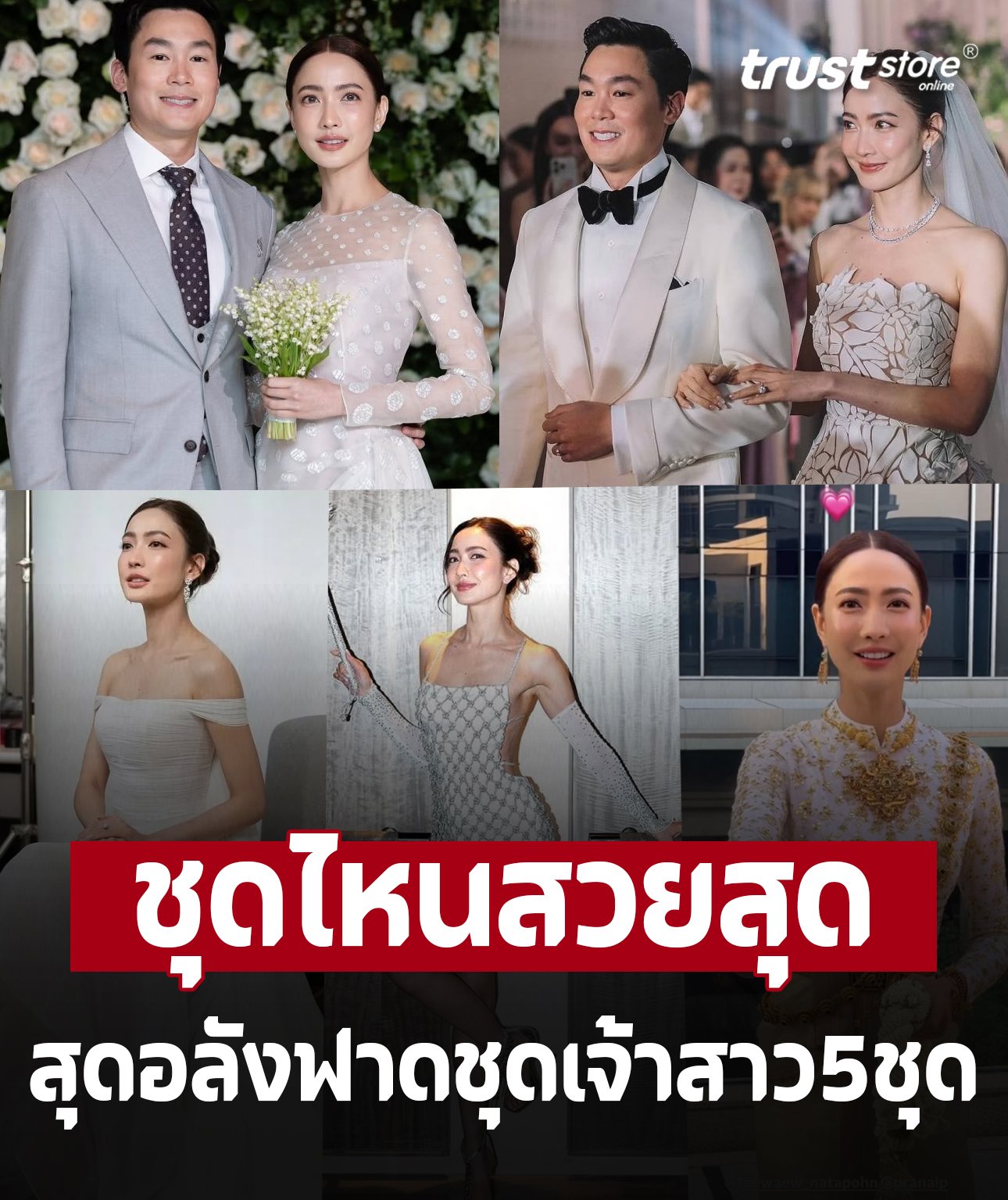 งานนี้ไฮไลต์เด่นที่ทุกคนจับตามอง คือ ชุดเจ้าสาวทั้ง 5 ชุด ของสาวแต้ว ที่ถูกออกแบบมาอย่างประณีตและงดงามในทุกมุมมอง แต่ละชุดสะท้อนความเป็นตัวตนของเธอและความหรูหราสง่างามของเจ้าสาวได้อย่างชัดเจน ทีมงาน ที่นี่ดอทคอม ไม่พลาดรวบรวมลุคปัง ๆ ทั้ง 5 ลุคมาให้ทุกคนได้ชมกัน