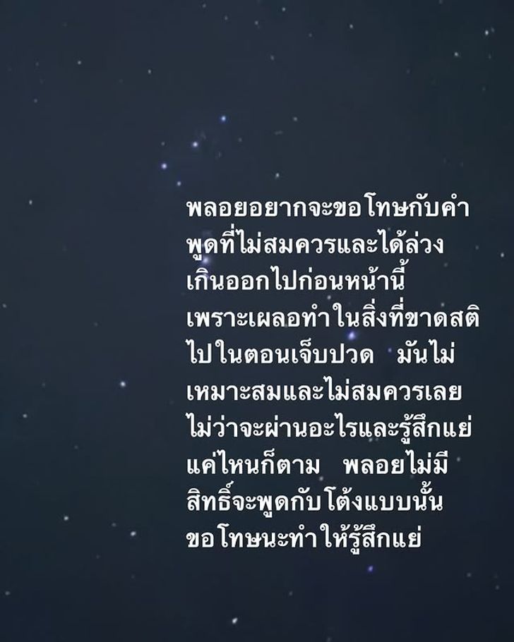 จนมาถึงโพสต์ล่าสุดของ พลอย เฌอมาลย์ ที่เธอไม่ได้ออกมาแฉใดๆ แต่เธอโพสต์ขอโทษ โต้ง ทูพี “พลอยอยากขอโทษกับคำพูดที่ไม่สมควรและได้ล่วงเกินออกไปก่อนหน้านี้เผลอทำในสิ่งที่ขาดสติไปในตอนเจ็บปวด มันไม่เหมาะสมและไม่สมควรเลย ไม่ว่าจะผ่านอะไรและรู้สึกแย่แค่ไหนก็ตาม พลอยไม่มีสิทธิ์จะพูดกับโต้งแบบนั้น ขอโทษนะทำให้รู้สึกแย่” พร้อมกับบอกถึงสถานะว่าเธอกับ โต้ง ทูพี เลิกกันมาได้สักพักและเป็นเพื่อนทีดีต่อกัน แต่มีบางสิ่งที่เธอเข้าใจผิด ซึ่งเธอยืนยันว่าไม่ได้เป็นเหตุการณ์ตอนคบกันแต่อย่างใด และเอ่ยขอบคุณทุกคนที่เป็นห่วง