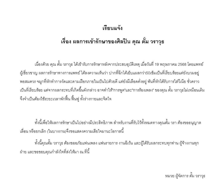 ทั้งนี้ คุณตั้ม วราวุธ ต้องขออภัยแฟนเพลง แฟนรายการ งานอีเวนต์ และผู้ได้รับผลกระทบทุกท่าน ผู้จ้างงานทุกฝ่าย และขอขอบคุณกำลังใจที่ส่งให้มา ณ ที่นี้