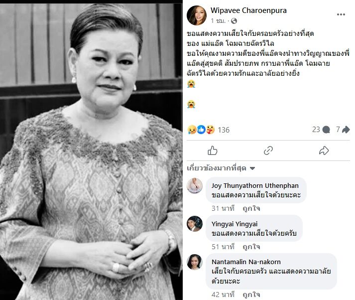 โดยการสูญเสียครั้งนี้ ถูกแจ้งผ่านเฟซบุ๊ก Wipavee Charoenpura ซึ่งเป็นของ กุ้ง วิภาวี เจริญปุระ ซึ่งเธอลงเป็นภาพ แม่แอ๊ด พร้อมแคปชันเศร้าระบุว่า “ขอแสดงความเสียใจกับครอบครัวอย่างที่สุด ของ แม่แอ๊ด โฉมฉาย ฉัตรวิไล”