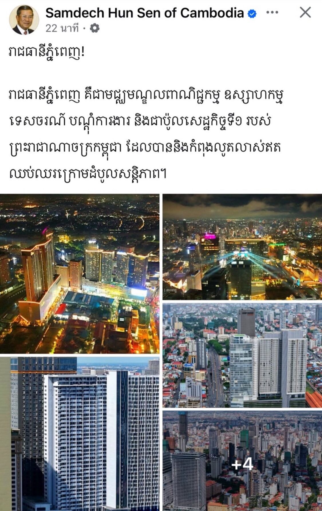 ล่าสุด ฮุน เซน ได้โพสต์ข้อความพร้อมรูปภาพผ่านเฟซบุ๊กส่วนตัวอีกครั้ง โดยเป็นภาพวิวทิวทัศน์กรุงพนมเปญ เมืองหลวงของกัมพูชา พร้อมระบุข้อความดังนี้