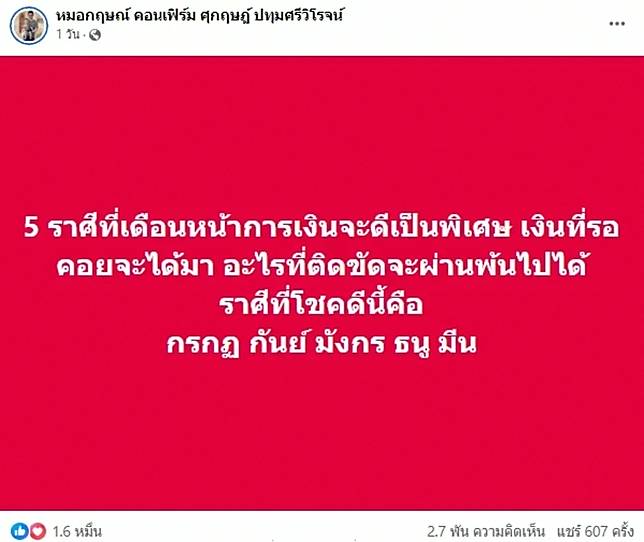 โดยทางด้าน หมอกฤษณ์ เปิดคำทำนายผ่านเฟซบุ๊ก หมอกฤษณ์ คอนเฟิร์ม ศุกฤษฎ์ ปทุมศรีวิโรจน์ ระบุว่า 5 ราศี เดือนหน้าการเงินจะดีเป็นพิเศษ เงินที่รอคอยจะได้มา อะไรที่ติดขัดจะผ่านพ้นไปได้ ได้แก่