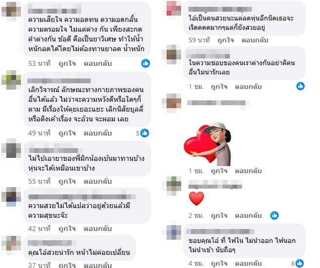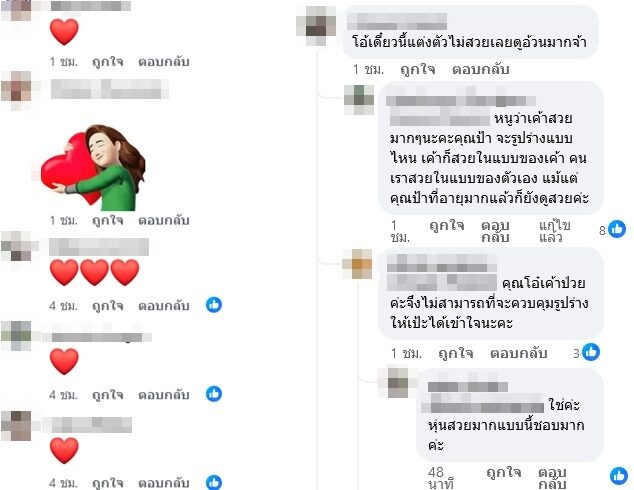 ขณะที่มีชาวเน็ตเข้าไปฟาดกลับคอมเมนต์ อาทิ เลิกวิจารณ์ ลักษณะทางกายภาพของคนอื่นได้แล้ว ไม่ว่าจะความหวังดีหรือใดๆก็ตาม มีเรื่องให้คุยเยอะแยะ เลิกนิสัยบูลลี่หรือติงเค้าเรื่อง จะอ้วน จะผอม เลย , หนูว่าเค้าสวยมากๆนะคะคุณป้า จะรูปร่างแบบไหน เค้าก็สวยในแบบของเค้า คนเราสวยในแบบของตัวเอง แม้แต่คุณป้าที่อายุมากแล้วก็ยังดูสวยค่ะ เป็นต้น