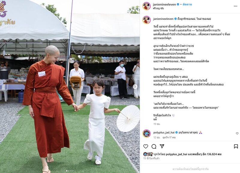 เป็นโพสต์ที่สุดซึ้งมากๆ หลังจาก สามเณรี เจนี่ หรือ สามเณรี ธัมมกัลยาณี บวชวันแรก ได้เผยภาพกับ น้องโนล่า ลูกสาว พร้อมแคปชั่นถึงลูกน้อยที่หลายคนอ่านแล้วน้ำตาไหลว่า“ถึงลูกรักของแม่, โนล่าของแม่