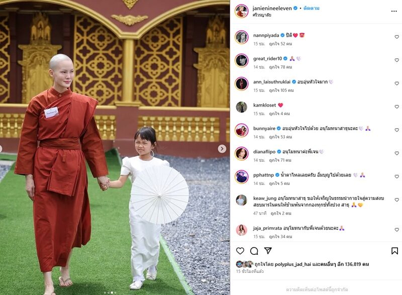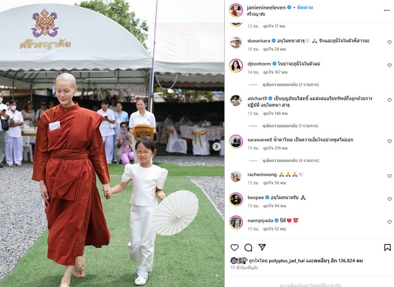 โดยทั้งเพื่อนๆคนบันเทิงและแฟนๆต่างคอมเมนต์อนุโมทนาบุญ น้ำตาไหล อิ่มเอมใจ อาทิ เป็นบุญอันบริสุทธิ์ แม่ส่งต่ออริยทรัพย์ถึงลูกด้วยการปฏิบัติ อนุโมทนา สาธุ , น้ำตาไหล เป็นความอิ่มใจอย่างพูดไม่ออก , อบอุ่นหัวใจมาก , อบอุ่นหัวใจไปด้วย อนุโมทนาสาธุนะคะ , น้ำตาไหลเลยครับ อิ่มบุญไปด้วยเลย เป็นต้น