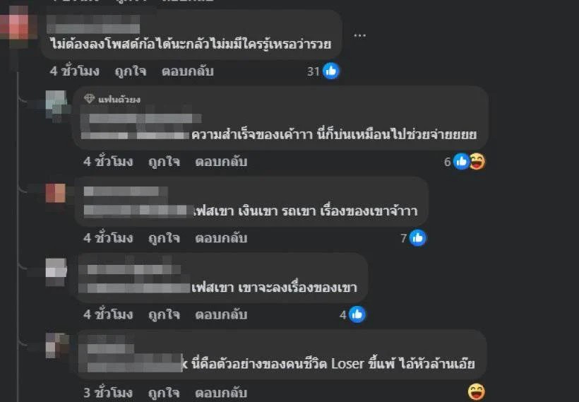 จากนั้นก็ได้มีแฟนคลับบางส่วนเข้าไปตอบกลับแทนทันที “ความสำเร็จของเค้าาา นี่ก็บ่นเหมือนไปช่วยจ่ายยยย”, “เฟสเขา เงินเขา รถเขา เรื่องของเขาจ้าาา”, “เฟสเขา เขาจะลงเรื่องของเขา”, “นี่คือตัวอย่างของคนชีวิต Loser ขี้แพ้ ไอ้หัวล้านเอ๊ย”