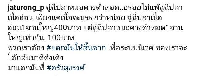 และอีกแคปชั่นเขียนว่า “ฉู่ฉีปลาหมอคางดำทอด..อร่อยไม่แพ้ฉู่ฉีปลาเนื้ออ่อน เพียงแค่เนื้อจะแข็งกว่าหน่อย ฉู่ฉี่ปลาเนื้ออ่อน1จานใหญ่400บาท แต่ฉู่ฉี่ปลาหมอคางดำทอด1จานใหญ่เท่ากัน. 100บาท พวกเราต้อง #แดกมันให้สิ้นซาก เพื่อระบบนิเวศ ของเราจะได้กลับมาดีดังเดิม มาแดกมันที่ #ครัวลุงรงค์”