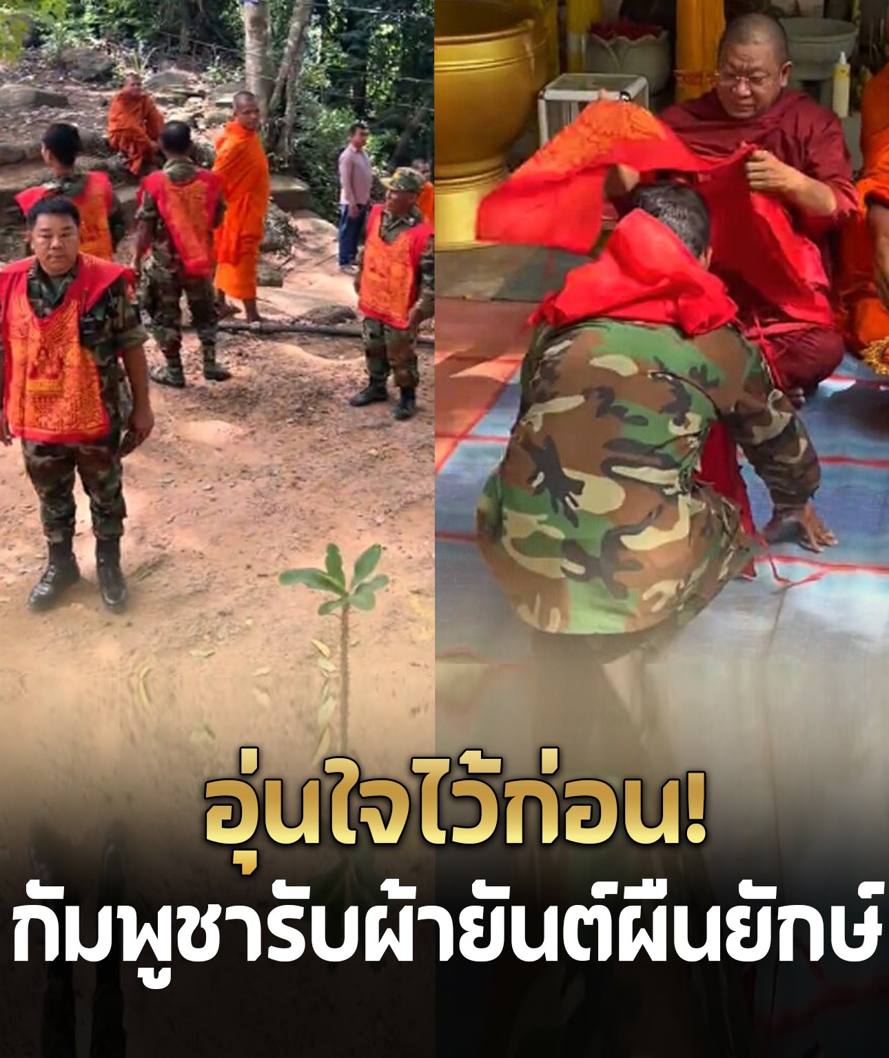 โดยในคลิปมีทหารกัมพูชาจำนวนมาก กำลังเข้ากราบไหว้และรับผ้ายันต์จากพระหลายรูปที่กำลังนั่งบริกรรมคาถาอยู่ ซึ่งผ้ายันต์ผืนนี้นั้นมีขนาดใหญ่มาก สามารถสวมคลุมร่างกายได้เลย เพื่อความอุ่นใจก่อนลงสมรภูมิและหลังจากคลิปดังกล่าวเผยแพร่ไปไม่นาน ก็มีชาวเน็ตชาวไทยเข้ามาแสดงความคิดเห็นกันจำนวนมาก พร้อมกับคุยแลกเปลี่ยนความคิดเห็นกันกับคลิปที่ได้รับชมไป