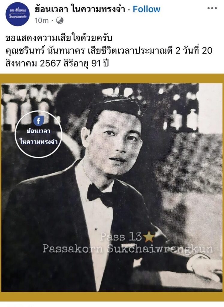 เมื่อวันที่ 20 สิงหาคม ผู้สื่อข่าวรายงานว่า ชรินทร์ นันทนาคร อายุ 91 ปี ศิลปินนักร้อง นักแสดง ผู้กำกับภาพยนตร์ ผู้อำนวยการสร้างภาพยนตร์ชาวไทย และศิลปินแห่งชาติ ได้ถึงแก่กรรมด้วยโรคชรา เมื่อเวลาประมาณ 2:00 น. ของวันที่ 20 สิงหาคม 2567 ณ โรงพยาบาลตำรวจ กรุงเทพมหานคร